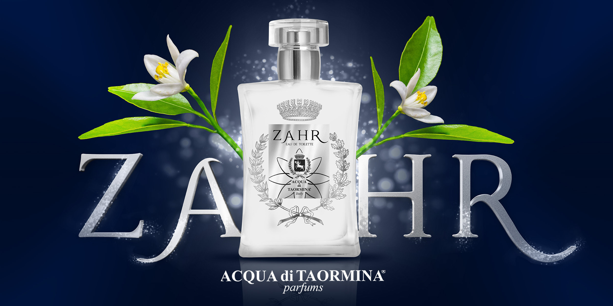 Nella parte frontale la preziosa serigrafia in argento della corona turrita, racchiude l’etichetta in lamina argentata dove vi è impresso il nome della fragranza … ZAHR … nome arabo che indica la Zagara.